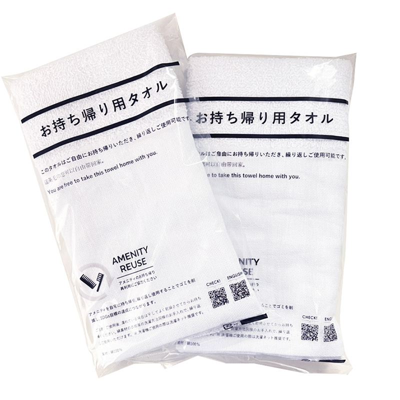 他の備品との持ち帰り可否を明確にするため、袋入りタイプを採用するケースが多くあります。DCアメニティでは「このタオルはお持ち帰り可能です」の記載が入った袋入りの使い捨てフェイスタオルも販売しており、多くのホテル・旅館各社様にご利用いただいています。