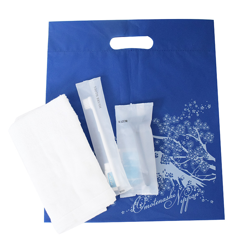 定番の歯ブラシ・タオルにカミソリが入ったベーシックなアメニティセットです。マットな質感の梨地+和柄プリントのバッグ入りはインバウンドのゲストにもご好評いただけます。